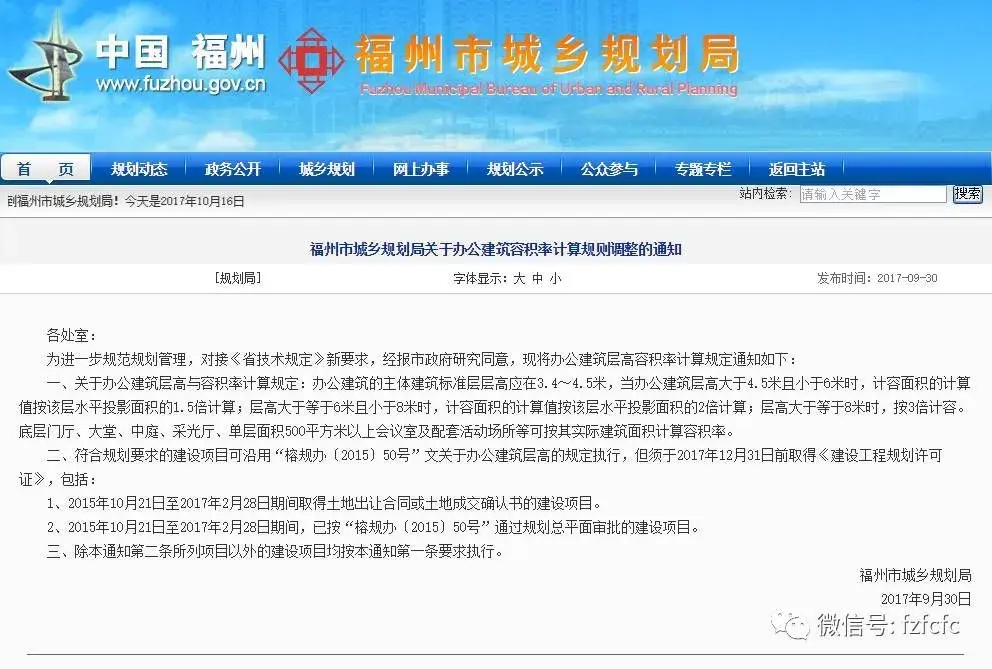 近日,福州市城乡规划局天博电子官网发布《福州市城乡规划局关于办公建筑容积率计算规则调整的通知》(以下简称《通知》)。据福州装修网了解,《通知》中规定,5米层高以上的办公室建筑面积将按1.5倍计容,层高大于8米以上则按3倍计容。